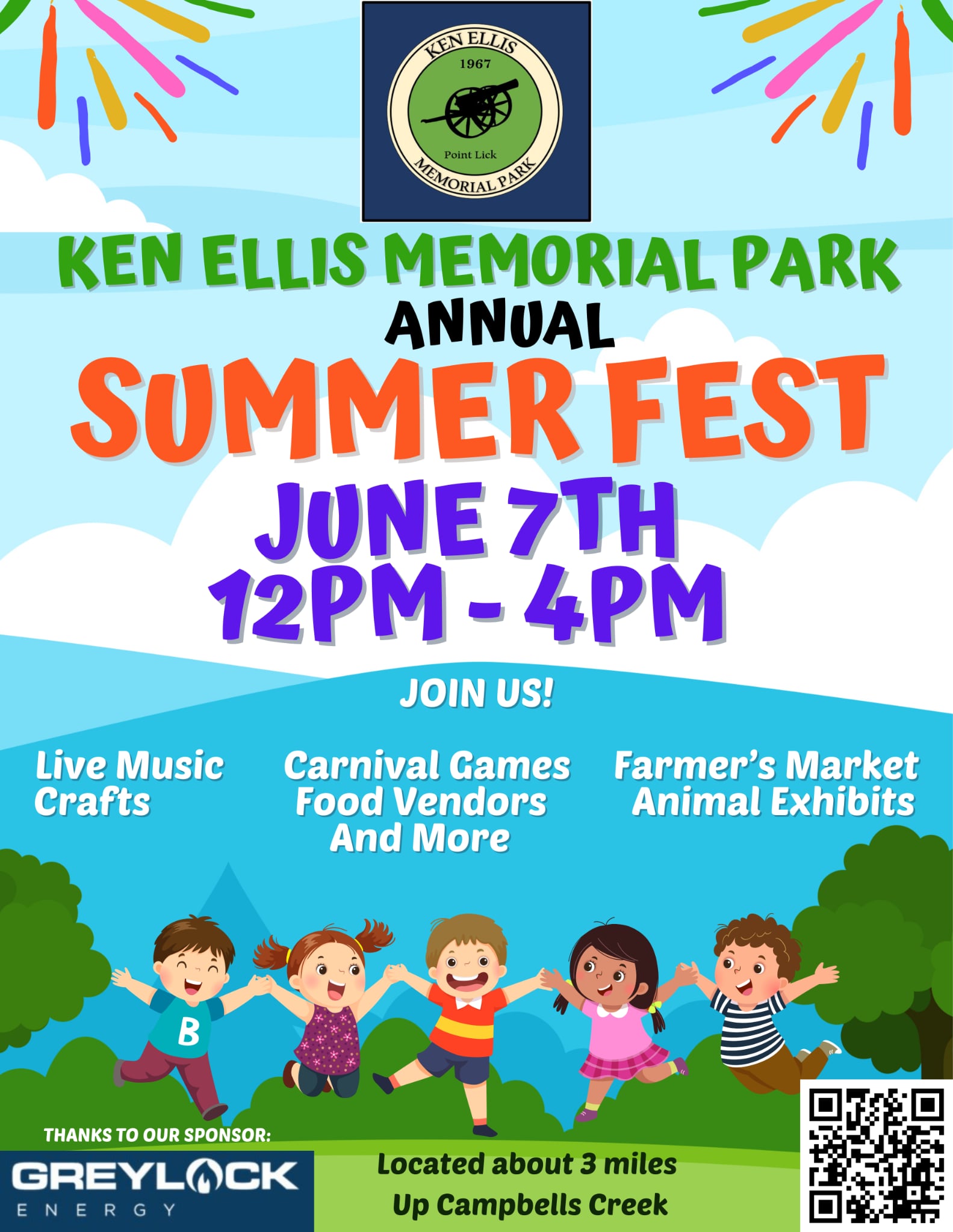 Ken Ellis Memorial Park, located about three miles up Campbells Creek across from Northeast Ballfield, hosts the annual community celebration, which is free and open to the public.