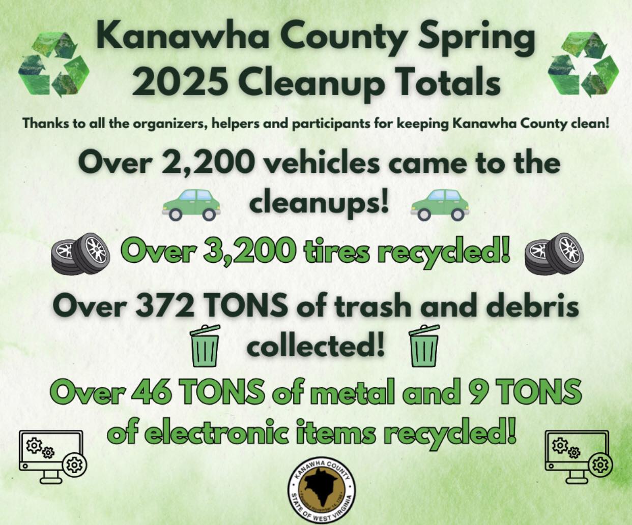 anawha County residents disposed of more than 400 tons of metal, electronics, debris and other unwanted items during the county’s spring cleanup, officials announced recently.